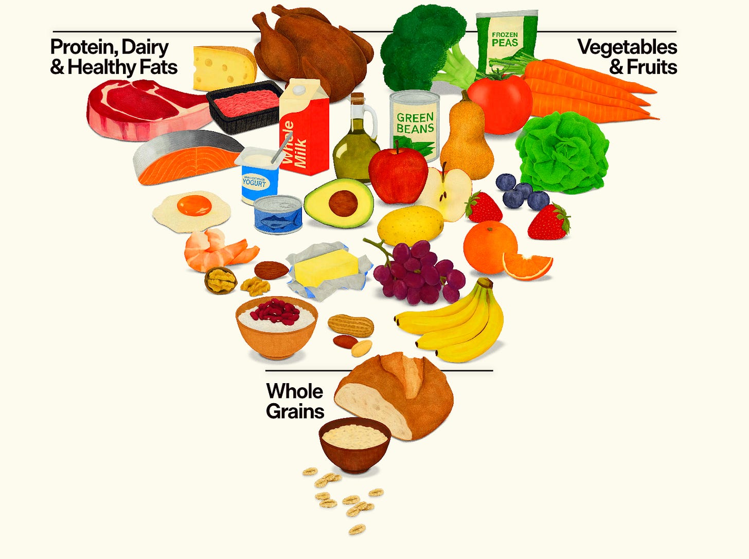 The decisive change came in the new food pyramid, which literally flips the old one on its head. Now even whole grains are minimized, and steak, cheese, whole milk, plus fruits and vegetables, are at the top. To justify this flip, the new guidelines reject more than half of the recommendations provided by the official Dietary Guidelines Advisory Council, an independent group of scientists that spent two years reviewing “gold-standard” research to make recommendations. (Yikes!)2